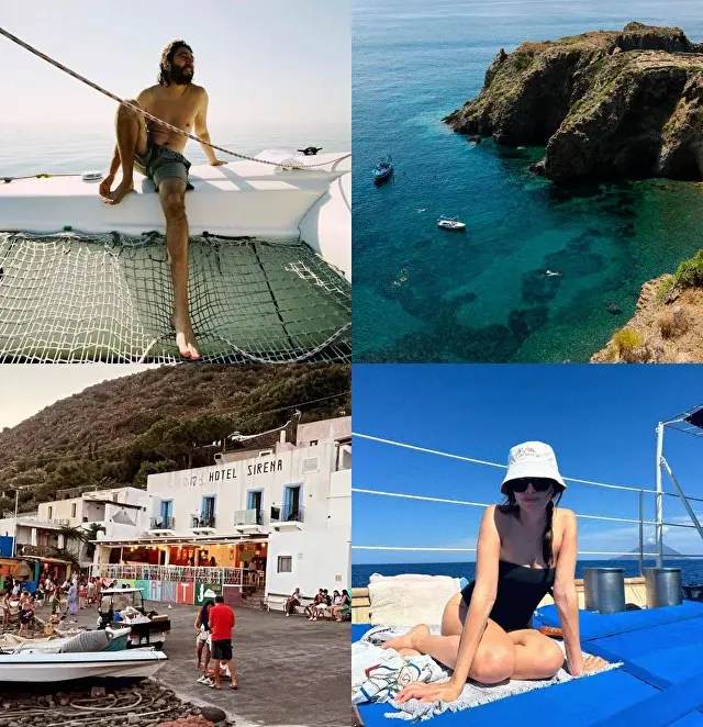 1. Ресторан Punta Lena на Стромболи. 2. Электра Ниархос, Бьянка Брандолини, Даша Жукова и Камиль Роу на Филикуди. 3. Даша Жукова на лодке у берегов Филикуди. 4. Ужин на Филикуди.